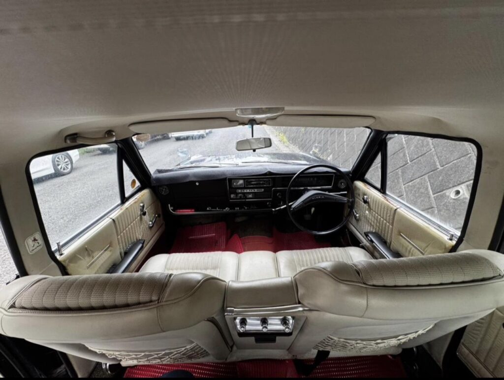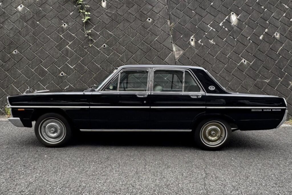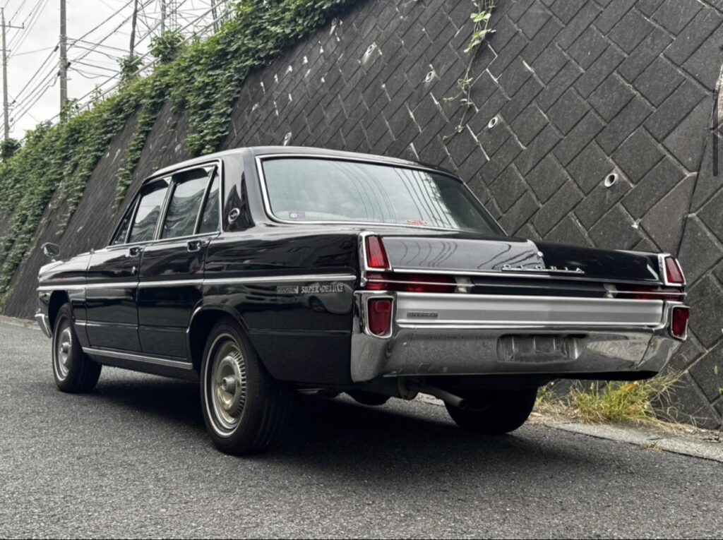 プリンス自工と日産自動車の合併に伴って「ニッサン・グロリア」として1967(昭和42)年にデビューした三代目・A30 型は、実質的には旧プリンスの開発車ですが、先代までの後輪ド・ディオンアクスルが一般的な縦置きリーフリジッドに変更されるなど、徐々に日産車との部品共用化が図られ ました。 A30 型のスタイリングは、前年発表の貴賓用リムジン「ニッサン・プリンス・ロイヤル」に似たイメージを持たせ、長く幅広く低重心の風貌は「ロイヤル・ライン」と称されました。特徴的な縦型4 灯式ヘッドランプから、通称「タテ目のグロリア」とも呼ばれます。このクルマは、最初期・1967 年のトップグレード「スーパーデラックス」となります。